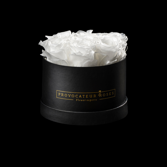 An iconic, deep black box elegantly frames the purity of 40 preserved white roses , hand-selected for their perfection. This piece conveys timeless sophistication, absolute calm, and a serene beauty that endures beyond time.
