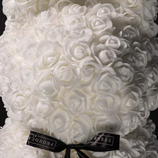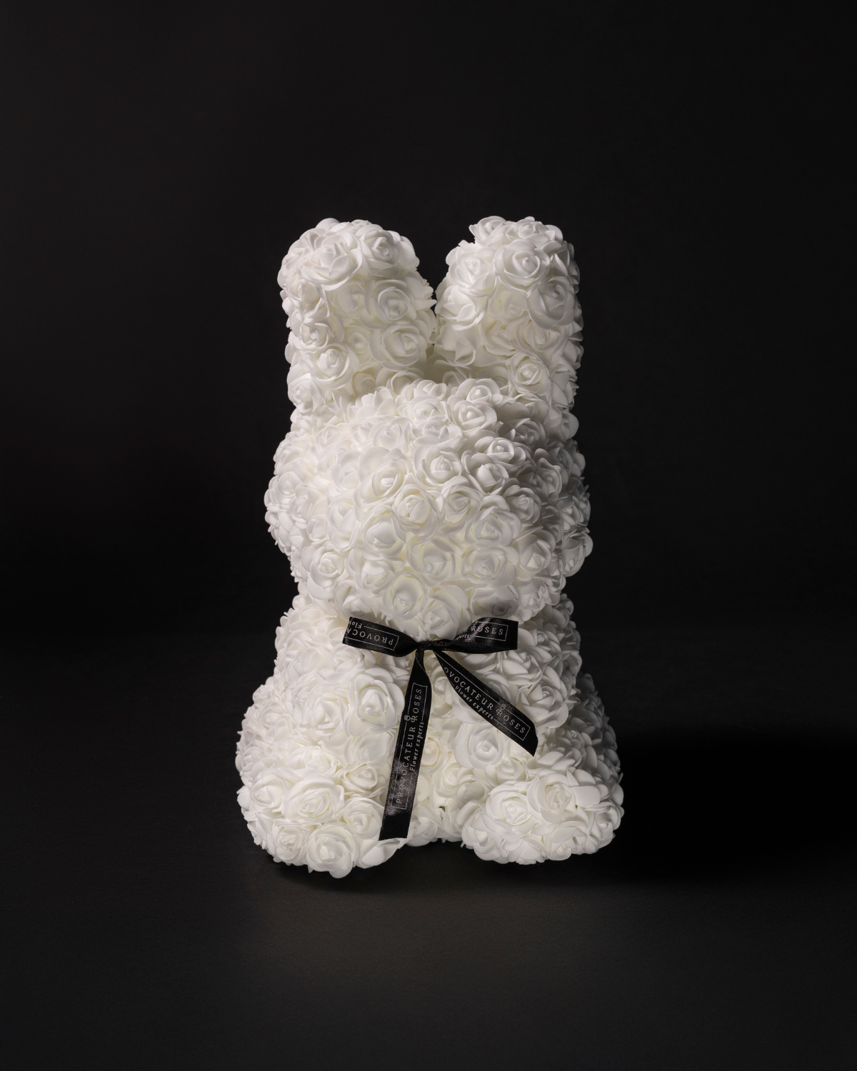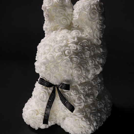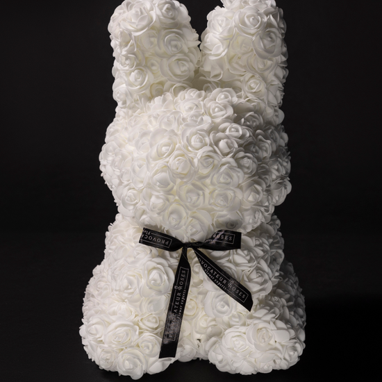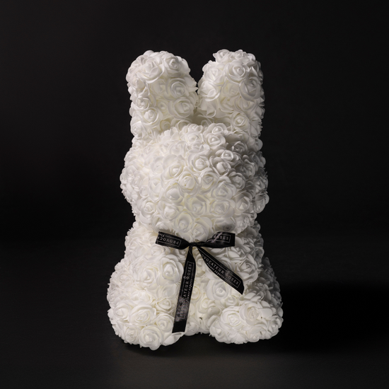 Delicate, luminous, and full of charm. The White Flower Bunny is handcrafted with exquisite ivory foam roses, creating a soft and comforting silhouette that conveys serenity from the first glance.
