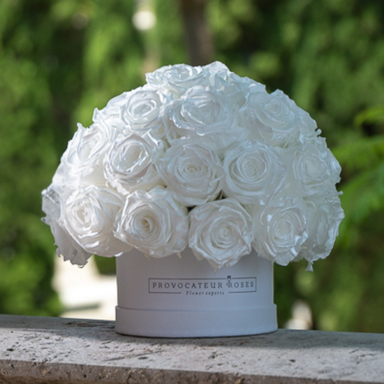 Sophistication at its finest. This elegant 18cm white box encloses 35 pure white preserved roses , carefully arranged in a perfect sphere. The result is a timeless, ethereal, and deeply impactful gift, ideal for those who value serene beauty with character.