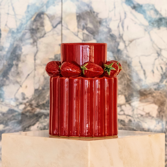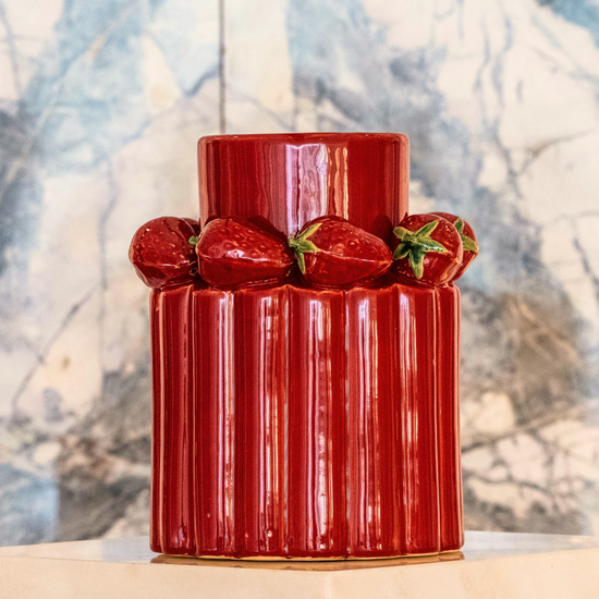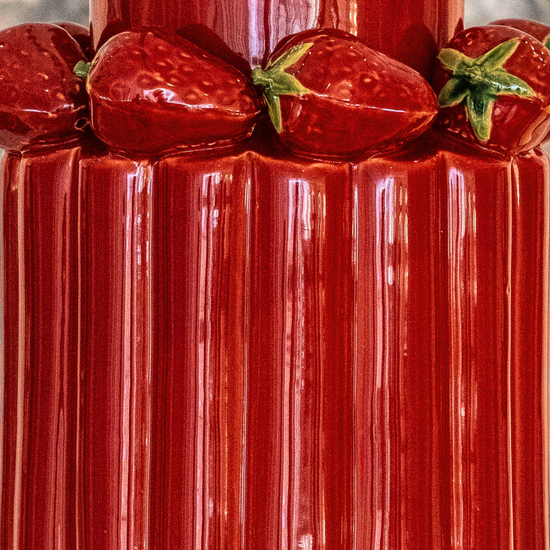 This deep red vase, with glazed strawberry reliefs, is much more than a functional object: it's a decorative piece with soul. Its embossed fruit details capture the freshness of a Mediterranean garden and awaken the senses with a playful and sophisticated touch. Perfect for settings with a distinct style.