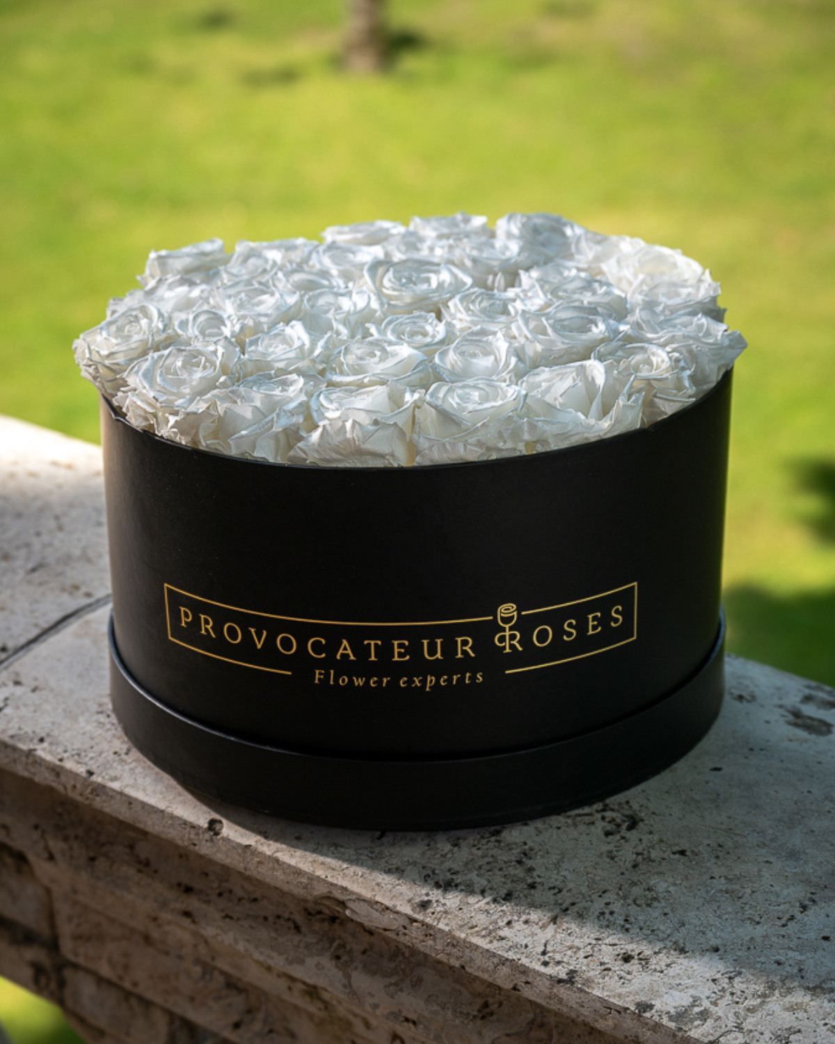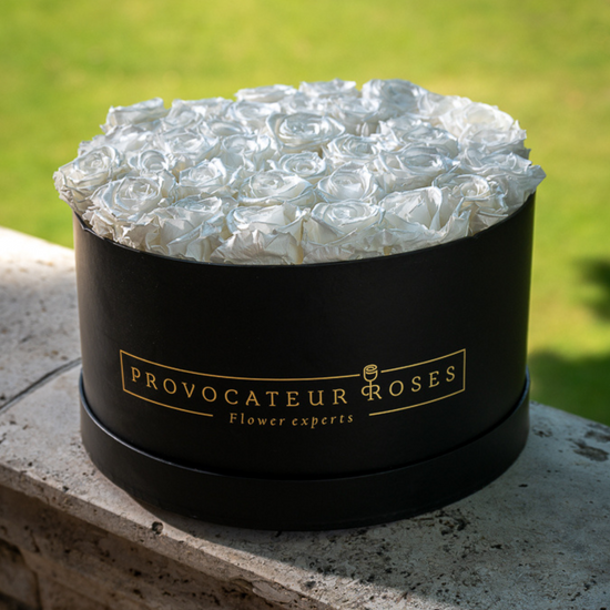 Minimalism, purity, and sophistication. This elegant 30cm box houses a symphony of eternal white roses that impress with their impeccable simplicity. Their presence imposes calm, their color conveys balance, and their design transforms any space into a temple of harmony. Ideal for those who value the essential, the serene, and the timeless.