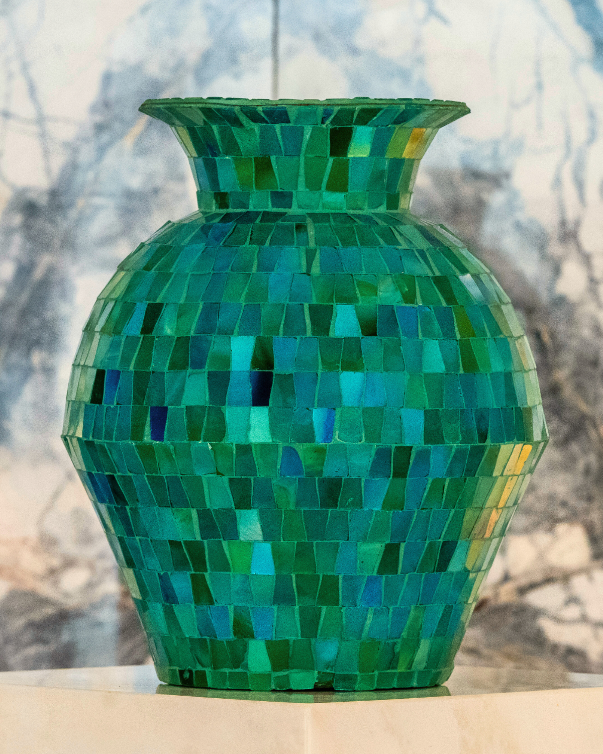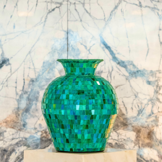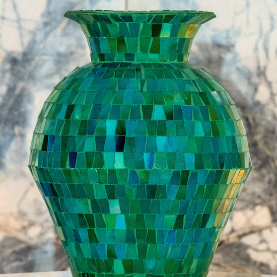 Le vase en mosaïque de jade allie une silhouette classique à une finition mosaïque irisée contemporaine. Sa structure arrondie et son large col en font une pièce à la fois sculpturale et fonctionnelle, capable de transformer n'importe quel espace grâce à sa luminosité unique. Chaque fragment reflète la lumière tel un trésor englouti, dans des tons de vert, de jade et de turquoise évoquant sérénité et sophistication.