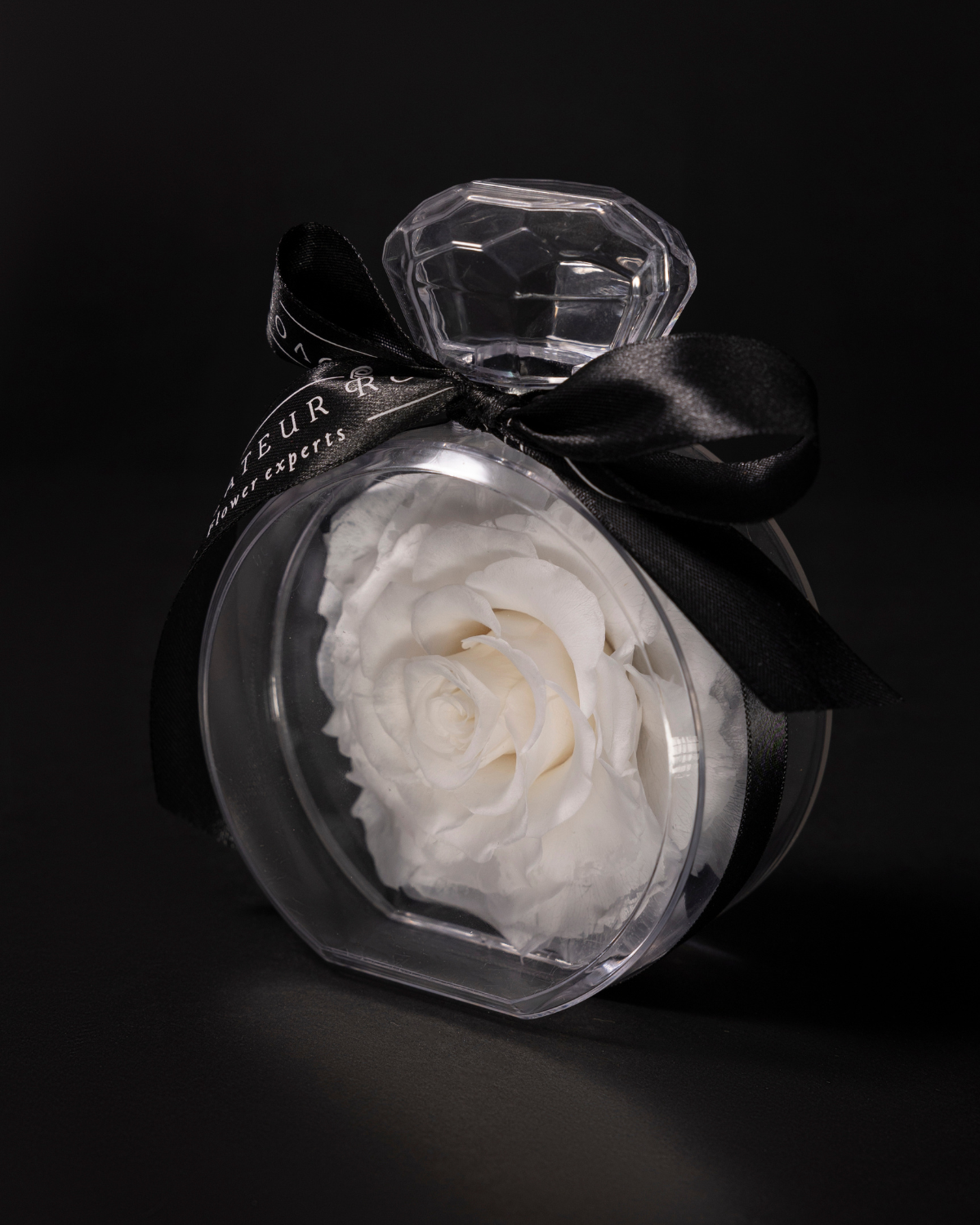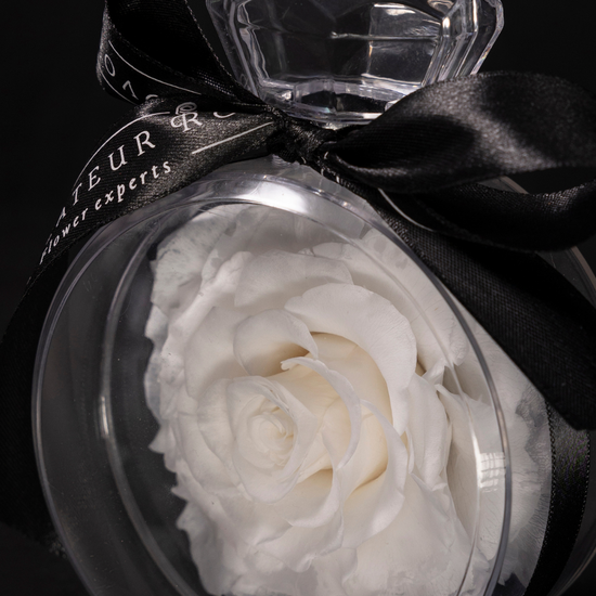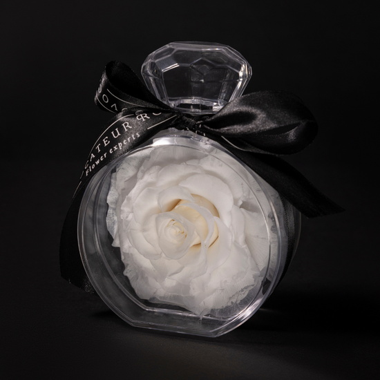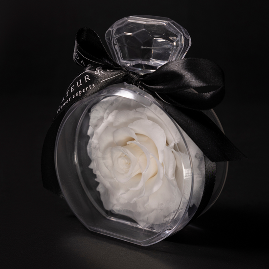 Une rose blanche préservée, encapsulée dans un délicat flacon inspiré d'un parfum, évoque l'élégance, la pureté et la sophistication. Ce petit objet de désir allie la légèreté du verre à la puissance symbolique d'une fleur immortelle. Sa présentation minimaliste, ornée d'un ruban de satin noir, en fait un cadeau ou un trésor précieux. Elle ne nécessite aucun entretien et conserve sa beauté pendant des années.