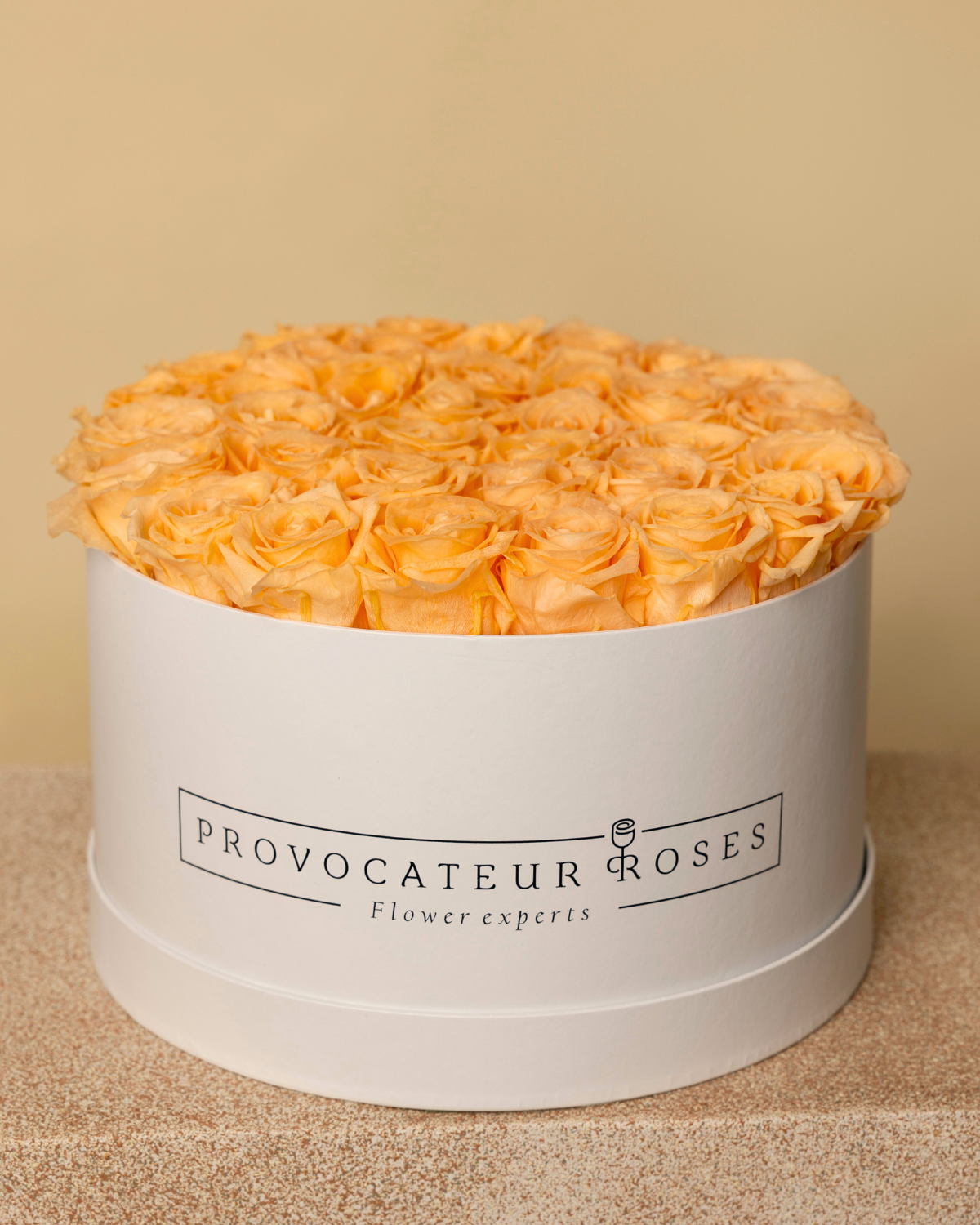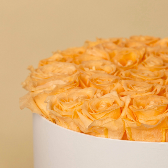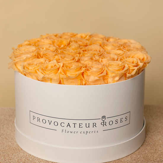 Un design intemporel qui respire la tendresse et la sophistication. 40 roses préservées couleur pêche , parfaitement disposées à l'intérieur de notre boîte blanche de 30 cm, créent une composition douce et enveloppante qui captivera au premier regard.