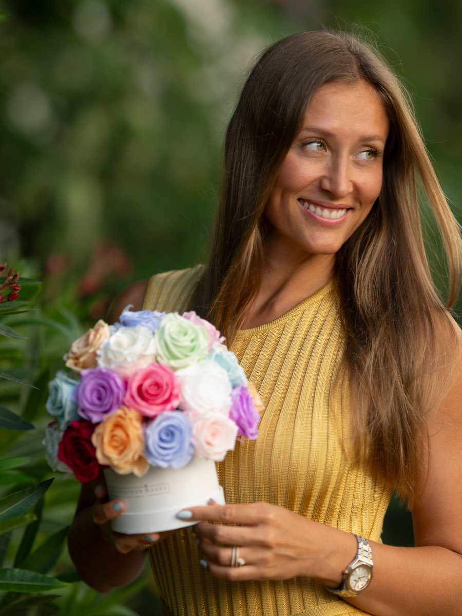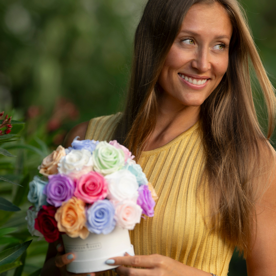 Una explosión de alegría, color y emociones eternas. Esta caja blanca presenta una exquisita selección de 30 rosas preservadas en tonos vibrantes, que evocan los días más felices del verano. Una composición radiante que transforma cualquier espacio en una celebración de vida y belleza.