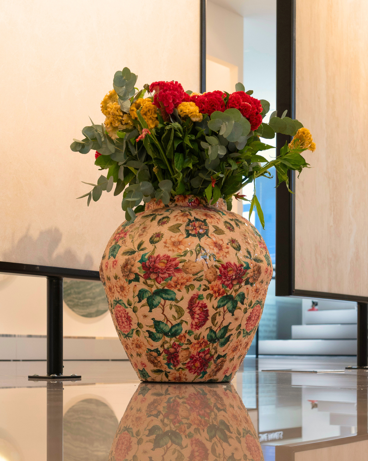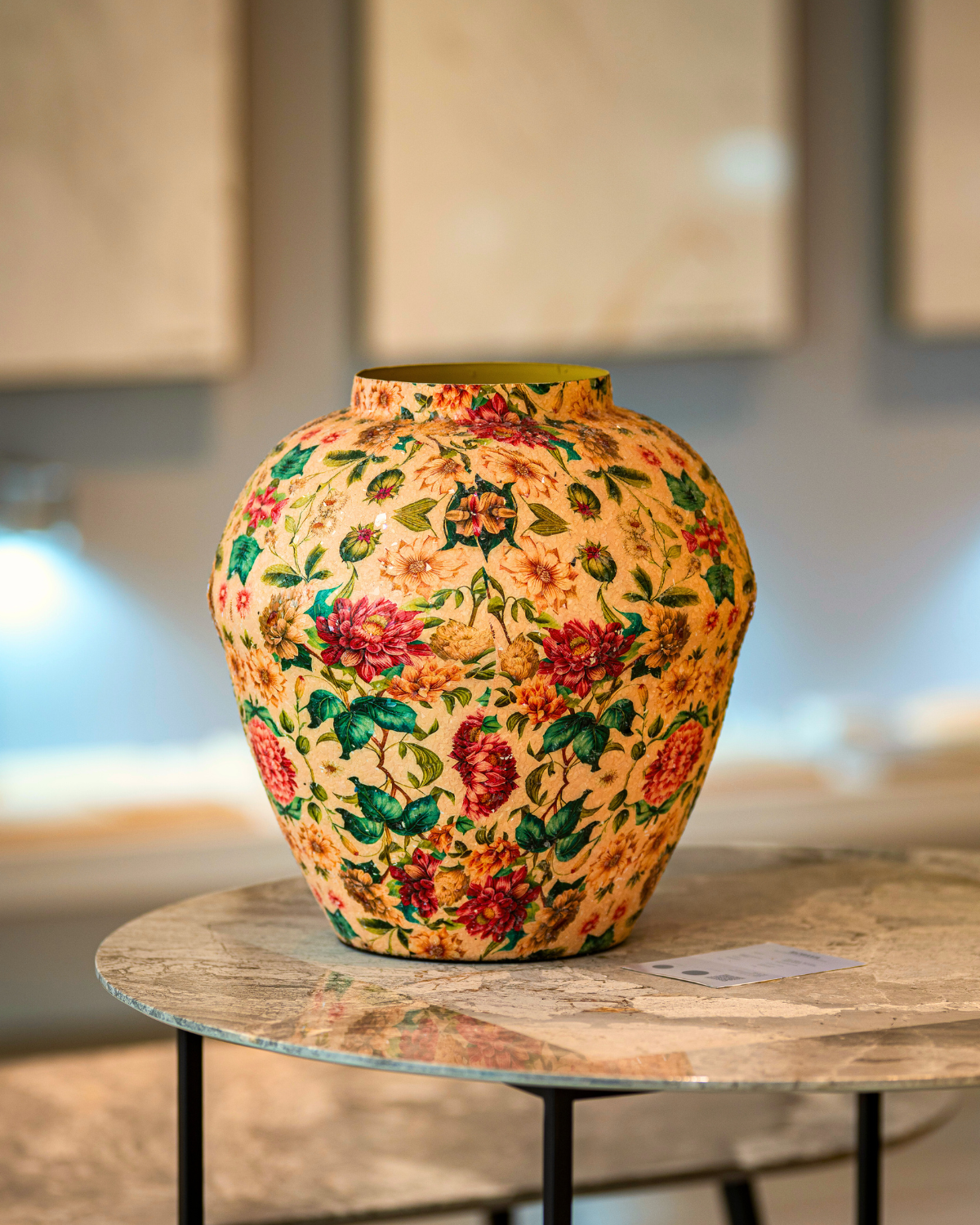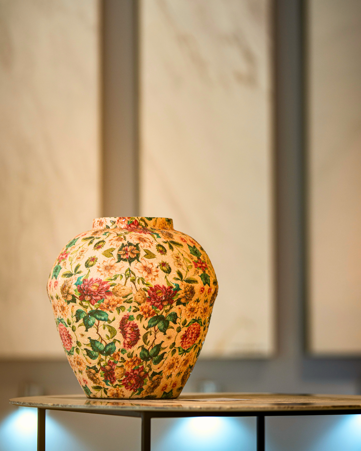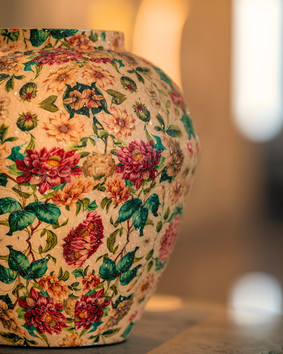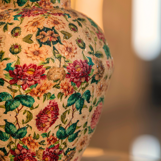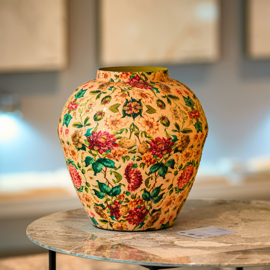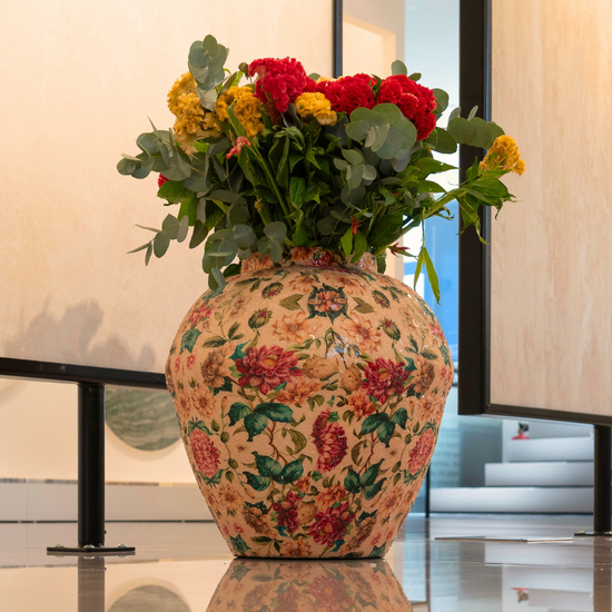 El Jarrón Jardín de Ensueño transforma cualquier ambiente en una escena sacada de un cuento romántico. Confeccionado en metal resistente y recubierto con un minucioso mosaico floral de escamas de vidrio, su textura rica y su brillo sutil evocan la elegancia de épocas pasadas.