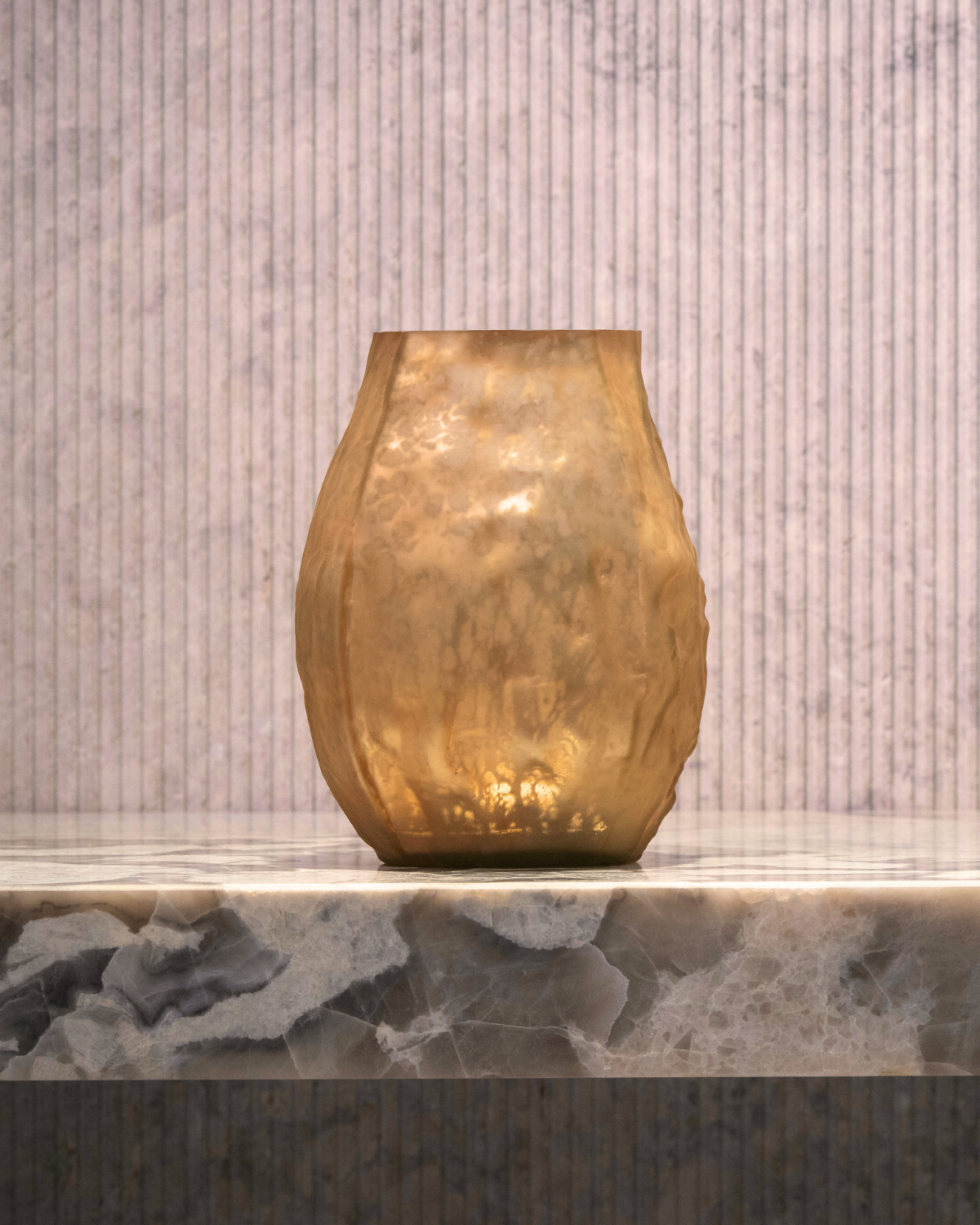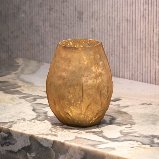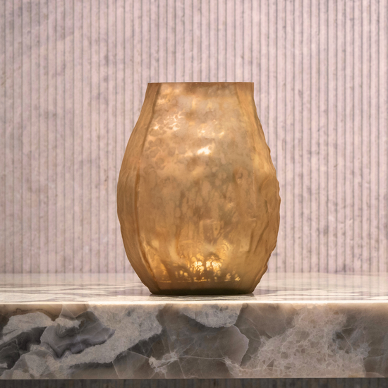 El Jarrón Materico Champagne está elaborado en vidrio iridiscente con textura artesanal, revelando un acabado nacarado que resplandece en tonos champagne según incide la luz. Su forma orgánica y su superficie ondulada evocan materiales naturales esculpidos por el tiempo, combinando fuerza y delicadeza en un solo objeto decorativo.