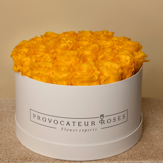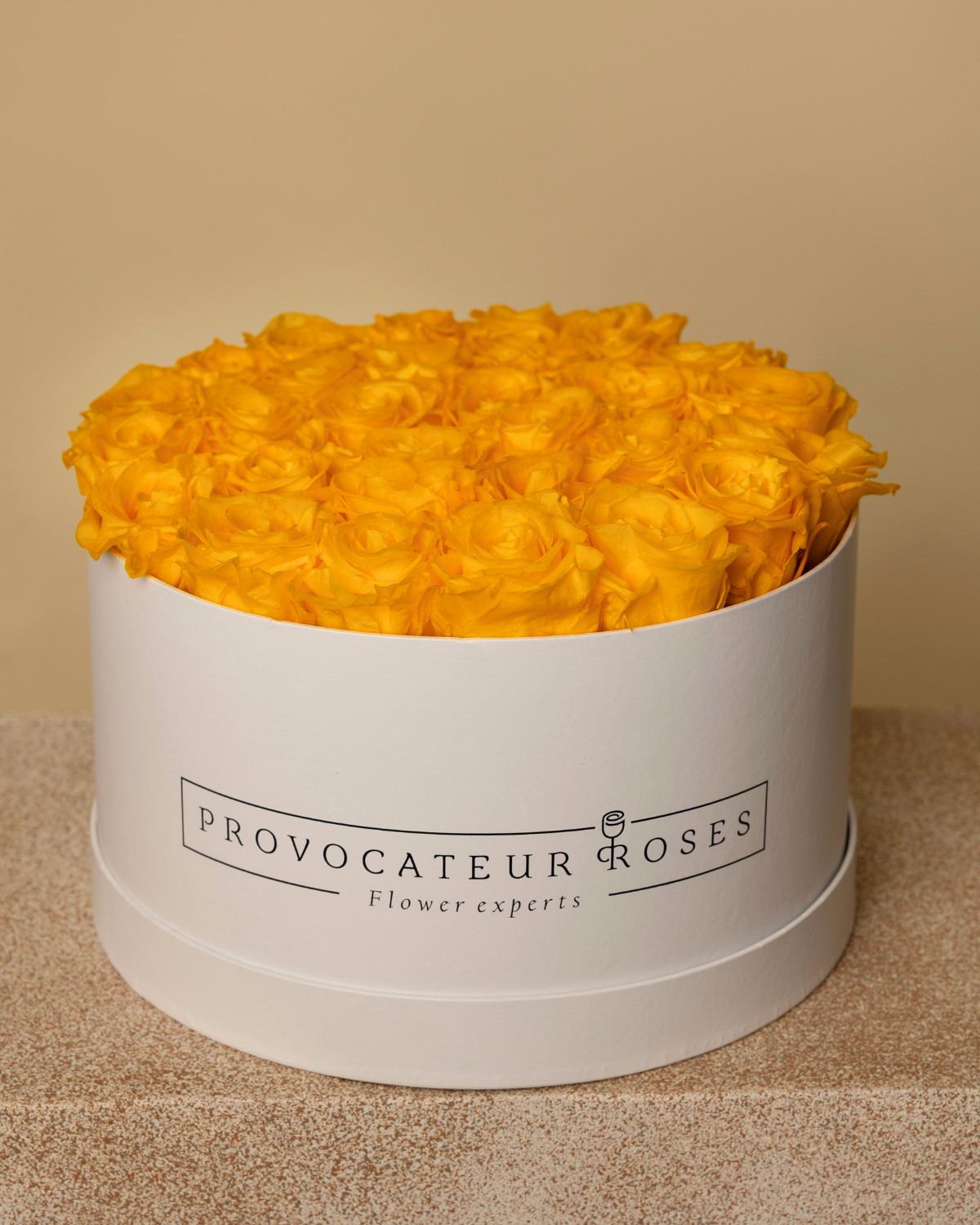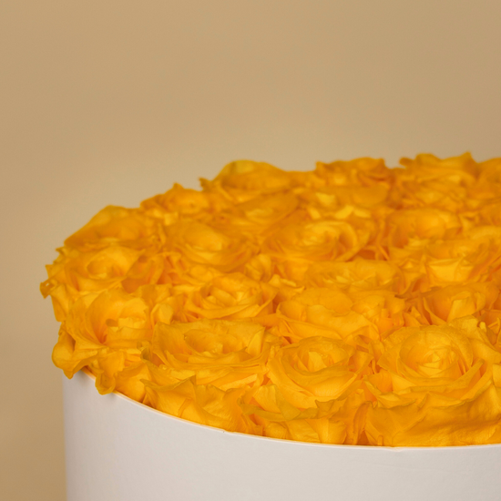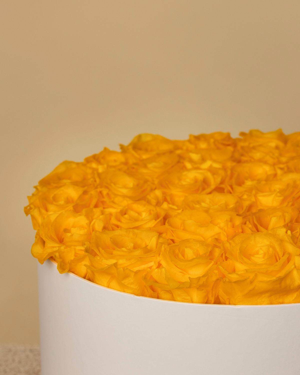 Una explosión de luz y alegría: 40 rosas preservadas en tono amarillo intenso brillan con fuerza dentro de nuestra icónica caja negra de 30 cm. Este diseño ilumina cualquier estancia y transforma lo cotidiano en un gesto inolvidable.