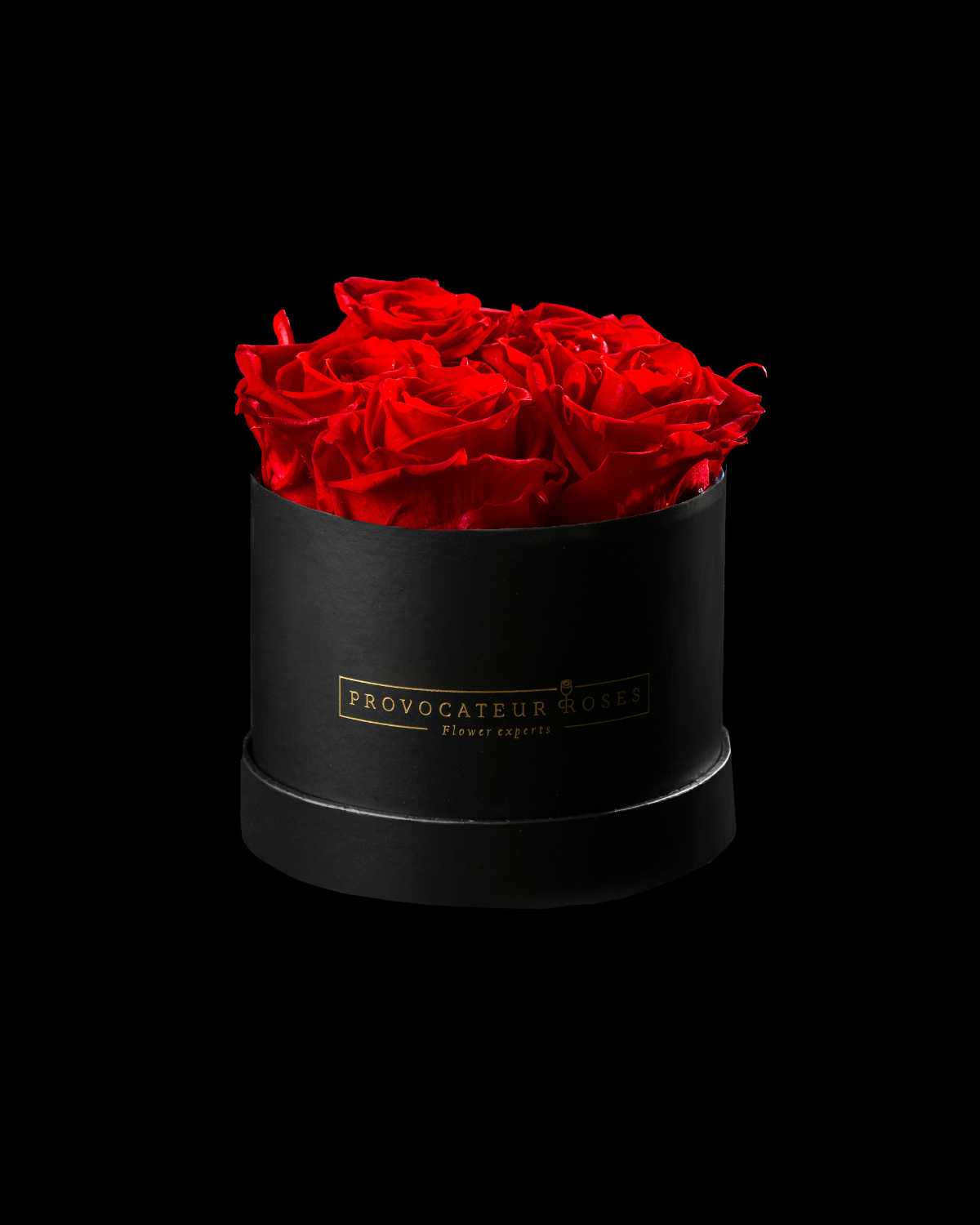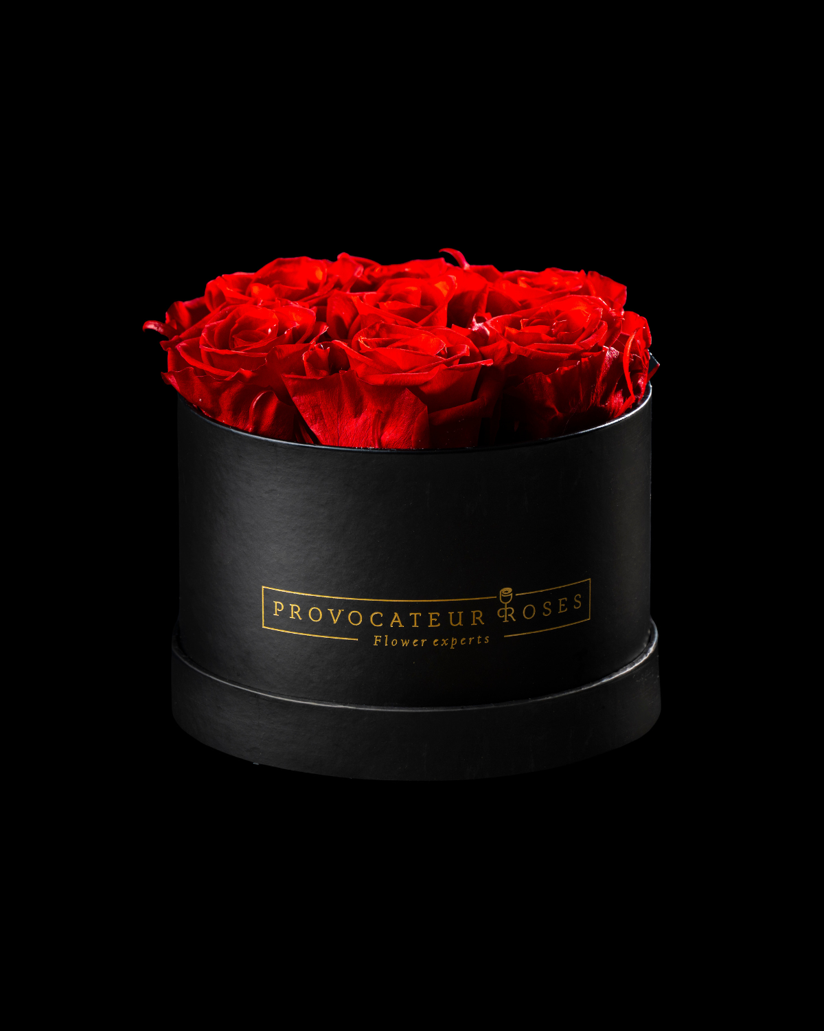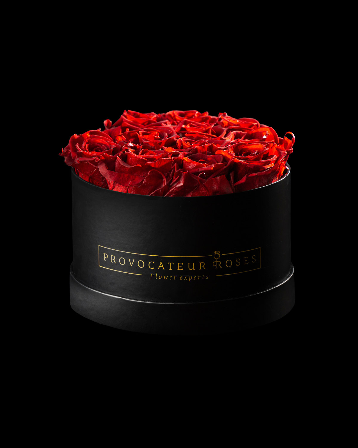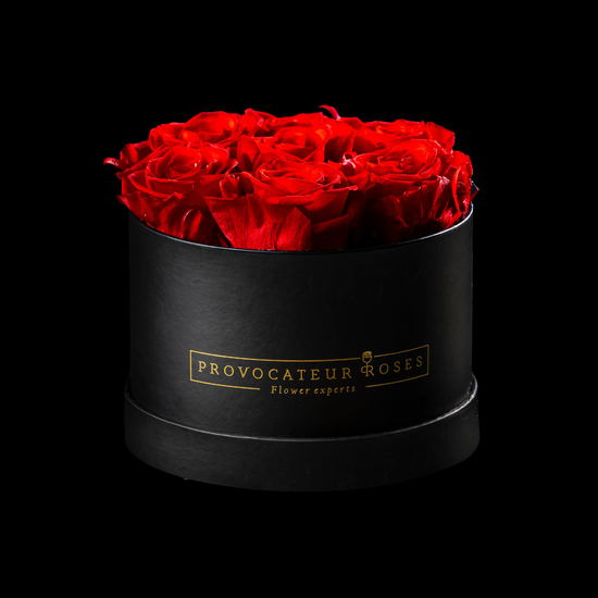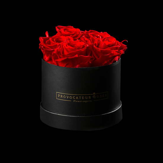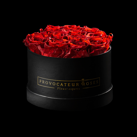 Las rosas rojas eternas son el símbolo universal del amor profundo. En esta versión, presentadas en una elegante caja negra con sello dorado, se transforman en un gesto moderno, sobrio y sofisticado, ideal para quienes aman sin excesos, pero con intensidad real.